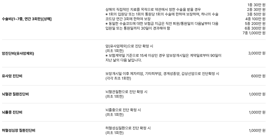 | 보장 항목 | 보장 금액 | 특이 사항 |